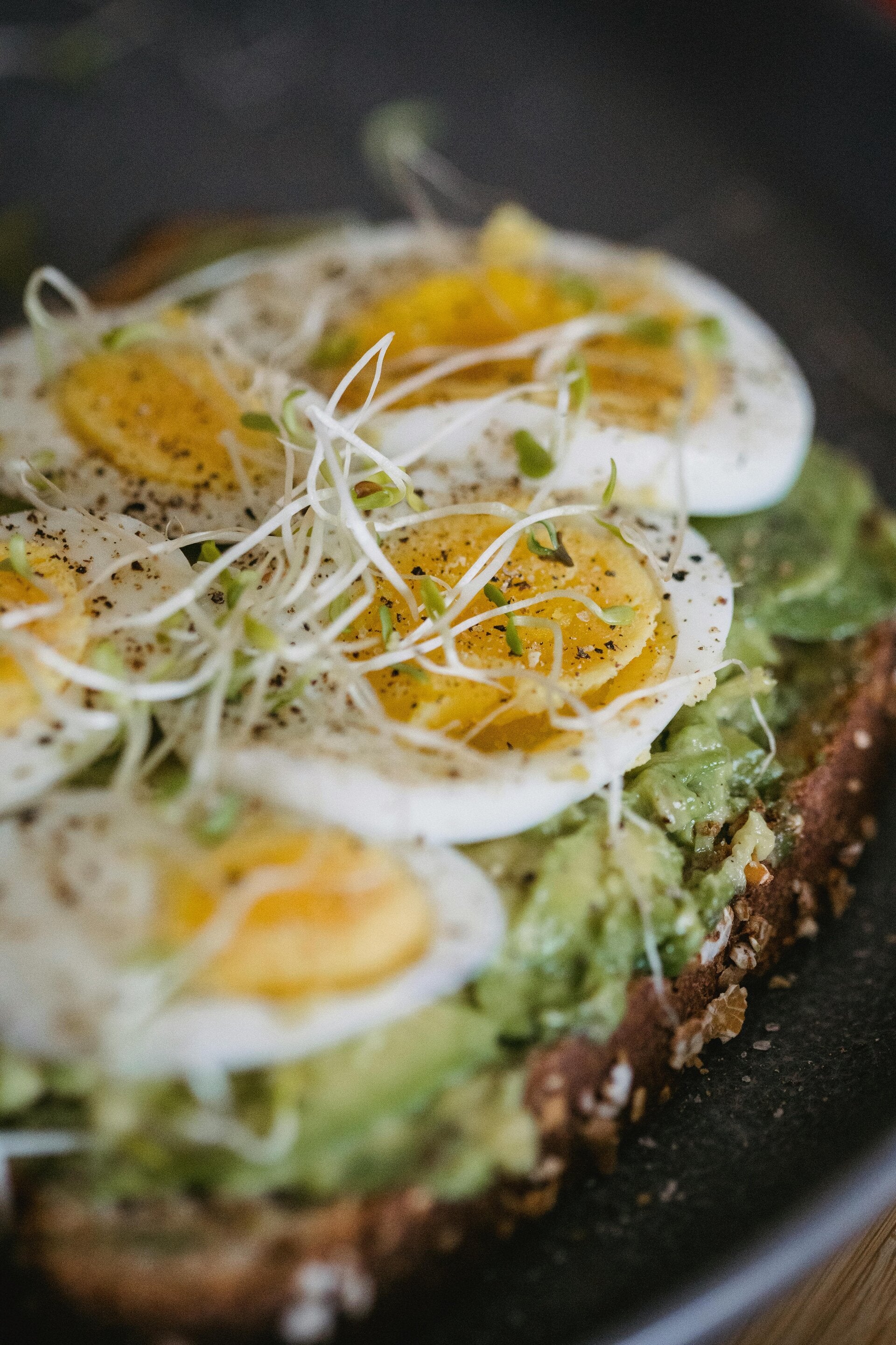 Tartinez le pain grillé, ajoutez l’œuf coupé en deux et parsemez de graines.